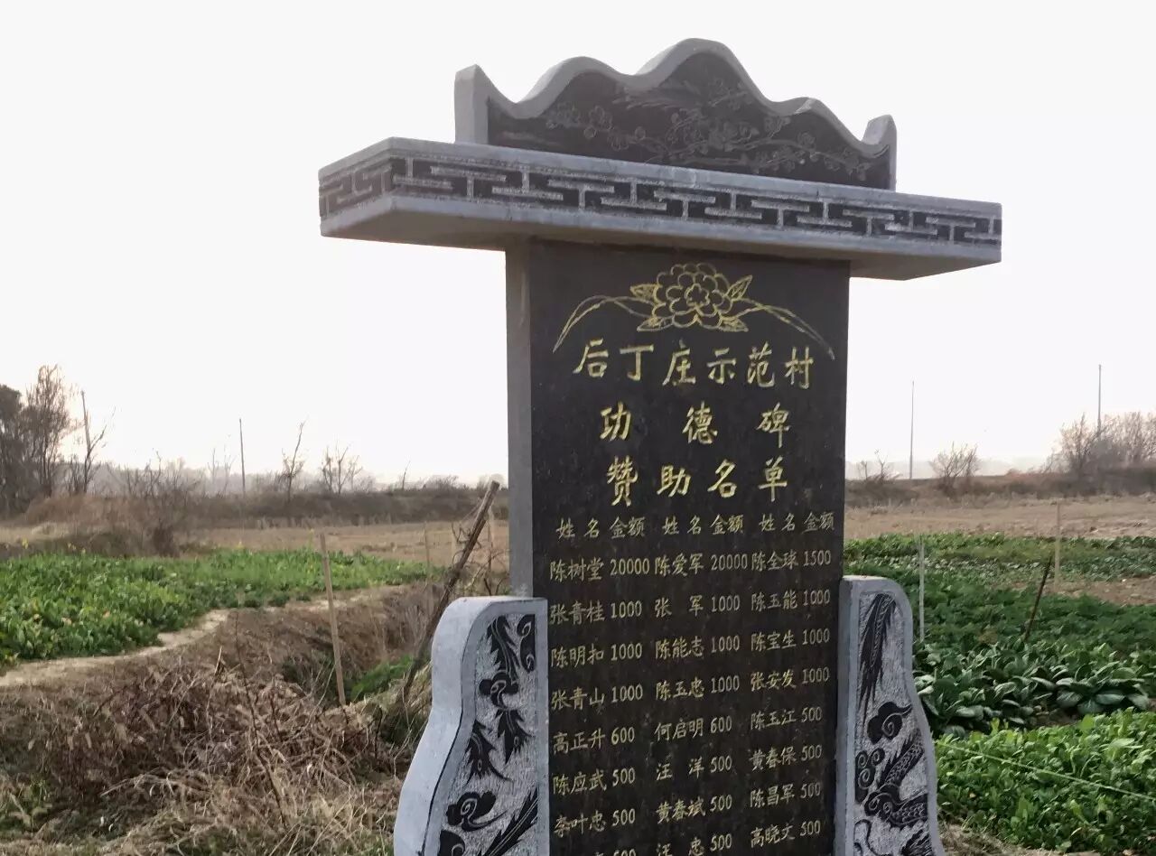 沿柏油路进村,距村口大约200米的马路边,立有一块后丁庄示范村的功德碑,上面刻录了捐款人的姓名及捐款数额。位列第一的赞助者是陈树堂,捐款2万元。除他外,捐款也是这个数的仅一人,余者为1500元以下。